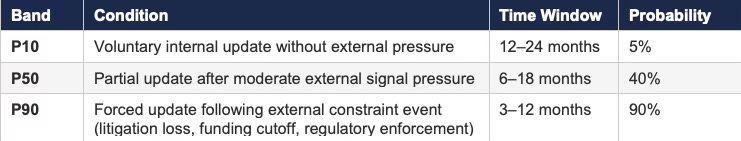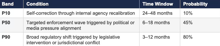Cross-system analysis reveals where mispricing accumulates and estimates the timing of correction when feedback loops close. A regulatory domain operating with five-year enforcement latency and diffuse accountability currently prices a set of incumbent behaviors as sustainable. When external shocks compress the feedback cycle — a congressional hearing, a court decision, a whistleblower disclosure — the correction reprices those behaviors rapidly. The prediction markets regulatory arc provides the sharpest published demonstration: Prediction Markets and the Regulatory Split deployed a CDT Foresight Simulation assigning P45/P35/P20 probabilities across three regulatory scenarios four days before three of six identified triggers activated simultaneously; Legislative Regime Conversion and the Collapse of Preemption then documented the state transition, confirming that loop closure arrived through the legislative channel rather than the appellate path the original model flagged as primary. Mapping that deviation — and the structural reason the SCEM moved faster than appellate review — is exactly the meta-level analysis the present framework advocates.