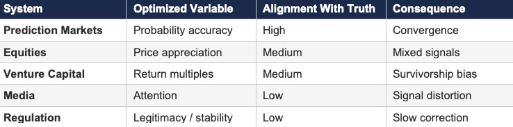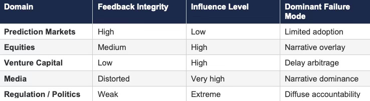 Prediction markets operate with rapid settlement, direct financial consequences, and unambiguous outcomes — high integrity throughout. Equities incorporate both price discovery and narrative interpretation, producing mixed signals. Venture capital introduces multi-year delays between investment and outcome, creating the structural conditions for delay arbitrage: valuations persist on narrative long after the underlying feedback would have forced repricing if it arrived faster. Media systems capture feedback rapidly in the form of engagement metrics but impose no cost for inaccuracy, producing a mis-specified control variable that rewards attention capture over truth.