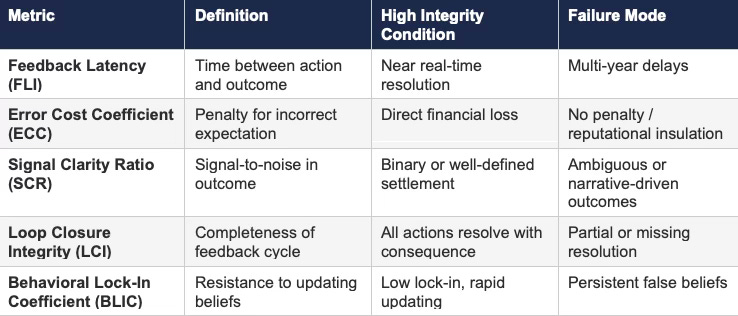 Feedback integrity determines whether a system converges toward truth or drifts into narrative. Systems with fast, costly, and clear feedback loops punish error and reward calibration. Systems with delayed, diffuse, or manipulable feedback loops allow mispricing to persist and compound.