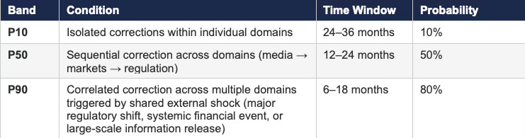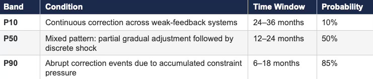 Eventual resolution will occur through discrete shocks that compress feedback suddenly. Market corrections, regulatory enforcement waves, or institutional failures will force rapid repricing of expectations that previously persisted under weak feedback conditions. Compressed feedback events tend to overshoot equilibrium because the accumulated mispricing resolves simultaneously rather than continuously.