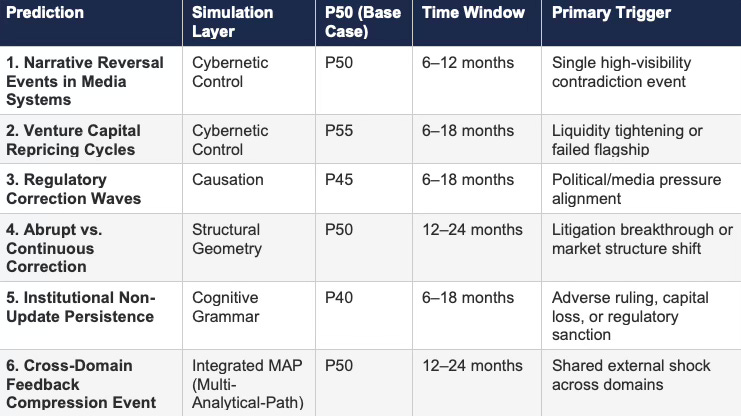 Strategic advantage accrues to systems that predict not only outcomes but the path by which feedback will force convergence. Actors insulated from error do not update voluntarily. Loop closure arrives externally — through litigation, market correction, electoral consequence, or institutional failure. Identifying which actors carry the largest unresolved feedback debt, and which external catalysts are positioned to compress their latency, generates the most actionable predictive insight available from meta-level analysis.