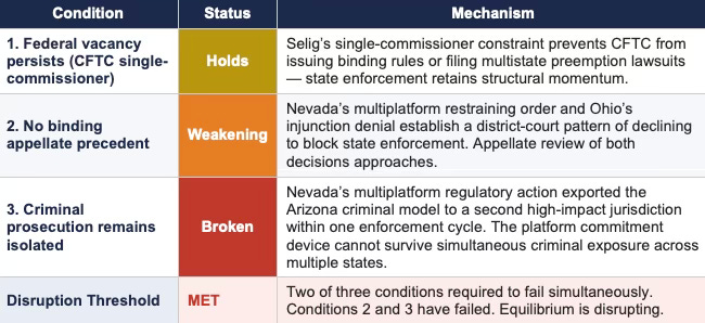 Condition 3 (Criminal prosecution remains isolated): Broken. Nevada’s multiplatform regulatory action demonstrates that the Arizona criminal model exported to a second high-impact jurisdiction within one enforcement cycle. Maintaining the preemption argument by refusing state jurisdiction through compliance — the core commitment device — cannot survive simultaneous criminal exposure across multiple states.