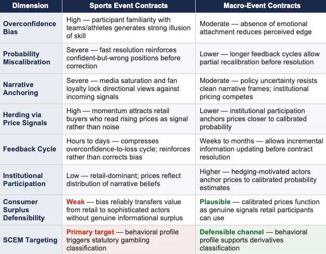 Recognizing the behavioral asymmetry between contract categories explains why the SCEM is selective rather than categorical. Regulators targeting sports contracts are not making a judgment about prediction markets as a technology. They are making a judgment about which contract categories generate consumer harm — where “harm” means a behavioral environment in which systematic bias reliably transfers value from retail participants to sophisticated actors without supplying the informational surplus that justifies the market’s existence. Macro-event and policy-forecast contracts retain a plausible consumer surplus argument because calibrated institutional participation generates prices that retail participants can use as genuine signals. Sports contracts do not retain that argument at scale: when participation is dominated by emotionally anchored retail actors, the price reflects the distribution of narrative beliefs rather than the distribution of informational edges. Applying behavioral economics rather than just gambling law, regulators targeting the SCEM at sports contracts are making a durable choice — one whose durability derives precisely from the behavioral asymmetry the statutory structure encodes.