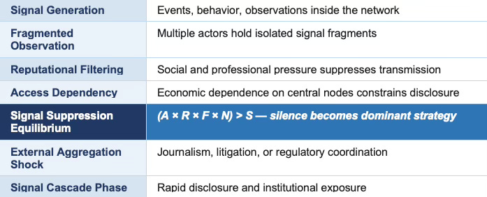 Fourth, suppressed signals propagate quickly through media networks and professional communities. Additional disclosures reinforce the new narrative, and silence ceases to be the dominant strategy. The cascade phase produces rapid institutional exposure after extended latency.