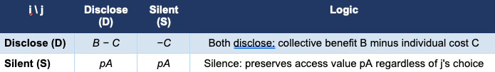 Payoffs reflect the following structure: disclosure imposes professional cost C when undertaken alone; disclosure generates collective benefit B if multiple actors disclose; silence preserves expected access value pA derived from network participation (where p weights access value by the probability that the network remains intact and retaliation-free).