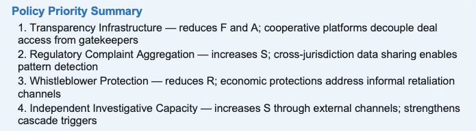 Economic policy should focus on strengthening information infrastructure rather than assuming misconduct arises purely from individual ethical failure. Market architecture determines whether signals surface early or remain hidden for years. Transparency infrastructure, regulatory aggregation capacity, whistleblower protection, and independent investigative channels are complementary interventions that collectively reduce SSI pressure before suppression equilibria fully form.