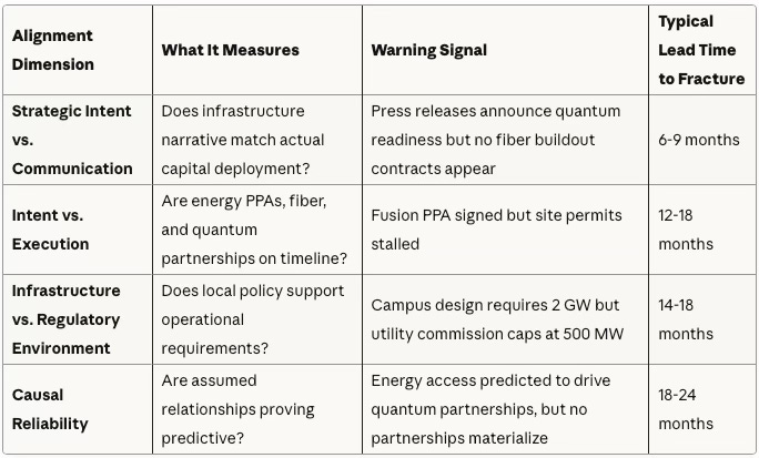 When alignment weakens—for instance, a mismatch between energy supply commitments and policy support—early warning indicators appear. This framework helps investors and operators anticipate instability and intervene before systemic stress escalates, directly supporting the thesis that coherence determines which campuses succeed.