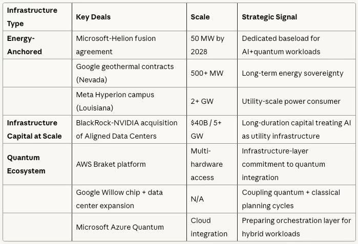 The shift from chip design to campus design is already underway. Microsoft, Google, BlackRock, and NVIDIA are deploying tens of billions in capital toward energy-anchored, quantum-anticipating infrastructure.
