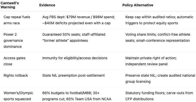 The alignment between Cantwell’s warning and this analysis is clear. She warned that repealing the revenue cap would fuel an arms race; the data show average FBS deficits could reach $40M annually even with a cap. She pointed to Power 2 dominance; our review shows guaranteed 50% voting control and stacked committees. She warned of rights rollback; our analysis shows NIL preemption eliminating athlete leverage after the House settlement ends.