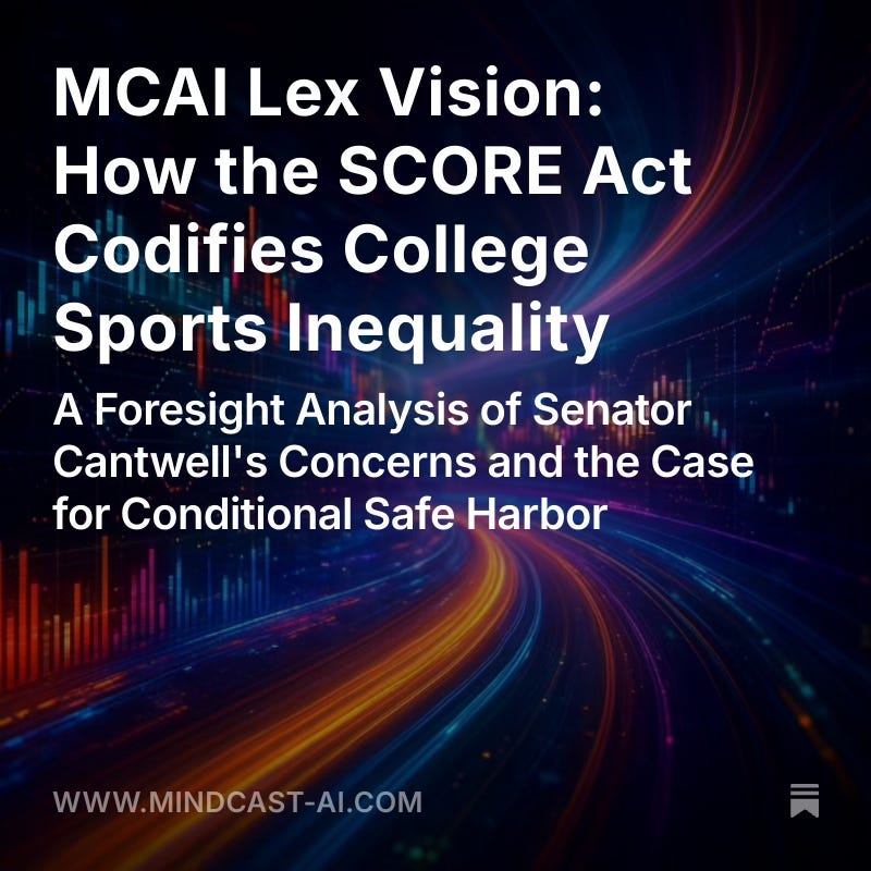 The publication demonstrates how MindCast AI applies foresight simulation to law and policy. In a letter to over 350 universities, Senator Cantwell has sounded the alarm about the SCORE Act, but warnings alone are not enough. Our approach projects how legislation behaves once enacted—how budget deficits, playoff access, and athlete rights evolve under the weight of federal immunity. By comparing Cantwell’s concerns, evidence, and policy alternatives, we show how today’s decisions become tomorrow’s structures. The analysis offers predictive insight that turns foresight into legislative design.