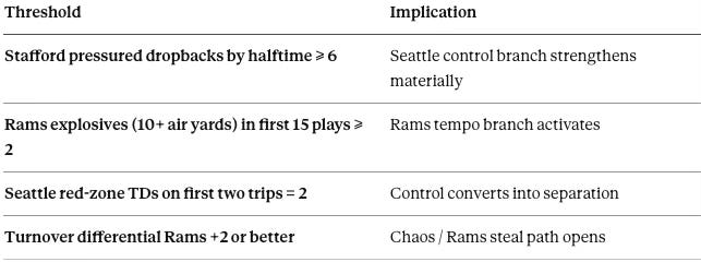 Threshold logic: If Seattle clears these gates, the Ramsâ volatility window closes rapidly after halftime.