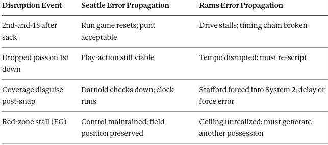 In the Ramsâ system, a single timing break (dropped pass, sack, coverage shift) propagates through the entire drive. In Seattleâs system, error propagation is capped by the run game and field position. Seattle can survive mistakes; the Rams need cleaner sequences to access their ceiling.