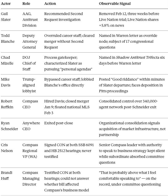 Compass sent an employee without clearance to answer the one question that mattered, and kept the people with clearance off the record. The committee transcript documents this. The congressional record now compounds it: Huff’s non-answer and Nelson’s silence, are now part of the same evidentiary surface as the Davis-Blanche bypass and the Slater removal. See How Compass’s State Legislative Testimony Undermined its Federal Antitrust Claims (January 30, 2026).