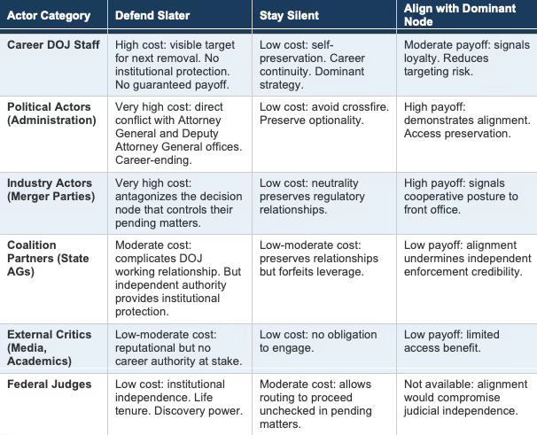 The critical question is therefore not “Why isn’t anyone defending Slater?” but “Does anyone with independent institutional authority have incentive to challenge the routing mechanism?” Only two actor categories meet that test: state attorneys general, who possess independent litigation authority and for whom alignment undermines enforcement credibility, and federal judges, who possess life tenure and discovery power and for whom alignment is structurally unavailable. Every other actor faces a payoff landscape where silence or alignment dominates.