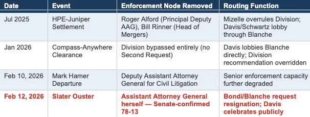 Trace the loop: Davis lobbies Blanche’s office to bypass Slater on HPE-Juniper. Mizelle overrules Slater and fires her deputies. Davis lobbies Blanche’s office again on Compass-Anywhere. Davis and Conway conduct Live Nation settlement talks through Blanche’s office, bypassing Slater a third time. Bondi overrules Slater on her own chief of staff. Slater is removed. Mizelle provides institutional justification (“personal agendas and vendettas”). Davis provides the public attack (“rabid Irish terrier,” “good riddance”). Davis celebrates the installation of someone he is close with. Davis issues a deterrence signal against the person who was removed. And Davis is about to sit for depositions about the mechanism he operated across all three cases.