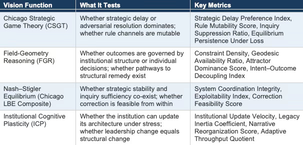 MindCast AI’s Cognitive Digital Twin (CDT) foresight simulations treat institutions as decision systems governed by constraints, routing architecture, incentive exposure, and rule mutability. “How MindCast AI Predicted the Slater Ouster Before the DOJ Executed It” (February 12, 2026) documented the full simulation output. Four Vision Functions serve as structural diagnostics rather than personality inference: