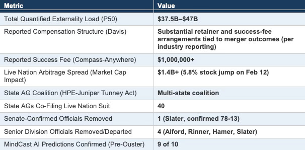 Externality estimates are derived from the MindCast AI Nash–Stigler framework using a 10-year harm window reflecting average merger-to-structural-correction cycles in concentrated markets. Discounting assumptions are conservative and fall within the range typically presented in federal regulatory analysis; sensitivity ranges are available upon request. Market share persistence assumptions are calibrated to post-merger Herfindahl-Hirschman Index (HHI) levels—the standard measure of market concentration used by federal antitrust enforcers—in the relevant markets. HPE-Juniper estimates reflect a 3-to-2 market structure in enterprise wireless local area networking (WLAN) with 70%+ combined share. Compass-Anywhere estimates reflect combined residential brokerage dominance exceeding DOJ Merger Guidelines thresholds (30%+ combined share) in multiple major metropolitan areas. Live Nation estimates reflect sustained vertical integration across ticketing, promotion, and venue operations in a market where the DOJ’s own complaint alleged illegal monopoly maintenance. Full methodology is available in “Nash–Stigler Equilibria & Comparative Externality Costs” (January 21, 2026).
