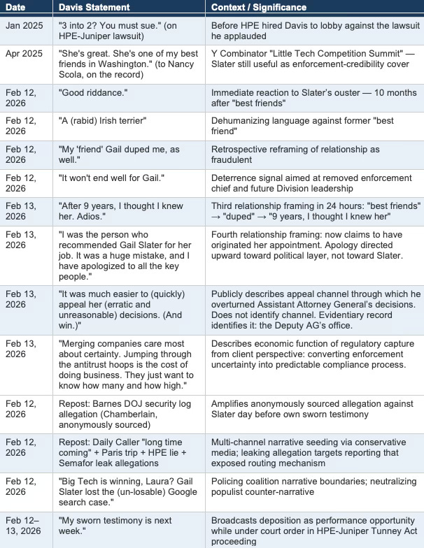 The Strategy: Davis deploys dehumanizing language against the enforcement chief he lobbied against—despite telling reporter Nancy Scola on the record ten months earlier (April 2025, Y Combinator “Little Tech Competition Summit”) that Slater was “one of my best friends in Washington.” This reversal is strategic, deployed precisely when the enforcement-minded actor has been removed and the narrative field is open for rewriting.
