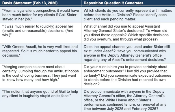 The Strategy: The single most significant post in the February 12–13 record. Davis explicitly acknowledges that he has clients with matters before the Antitrust Division, describes an “appeal” channel through which he challenged and overturned the Assistant Attorney General’s decisions, and states that he won. He does not identify the channel. The evidentiary record identifies it: the Deputy Attorney General’s office. State AG deposition counsel should place this post in front of Davis under oath and ask three questions: What channel did you use to “appeal” her decisions? Who did you appeal to? How did you “win”?