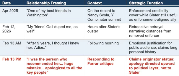 The Strategy: A fourth distinct relationship framing in under 36 hours. April 2025: “best friends.” February 12: “duped me.” February 13 morning: “After 9 years, I thought I knew her.” February 13 afternoon: “I was the person who recommended her.” Each iteration escalates his claimed proximity—and therefore the scale of the betrayal narrative. He now claims to have originated her appointment, a claim that positions him as the principal whose judgment was betrayed. His apology runs upward toward power (“all the key people”—Bondi, Blanche, the political layer), not laterally toward the person he called a “best friend” ten months earlier. He also names the approved populist enforcers (Ferguson, Carr, Assefi) to define who belongs inside the coalition—and who does not. Slater is excluded. The message: the routing mechanism is the populist enforcement program.