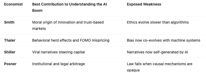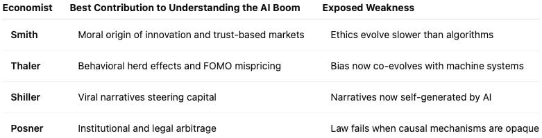 Together, these four thinkers reveal that markets are not mechanical engines but cognitive organisms. The AI boom can only be understood through moral, behavioral, narrative, and legal perspectives working in tandem.