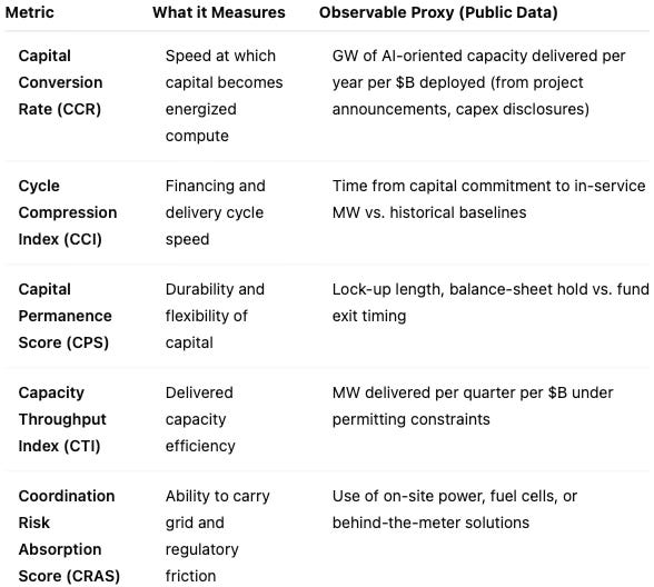 AI advantage has shifted from model quality and GPU access to capacity throughput —measured by Capital Conversion Rate (CCR) and Cycle Compression Index (CCI )—the speed at which capital converts into energized, permitted, and connected compute. SoftBank is not buying more chips; it is buying a platform that repeatedly converts capital into energized megawatts across geographies, as reflected in its stated goal of scaling next‑generation AI infrastructure through owned operating platforms (SoftBank press release, Dec. 29, 2025).
