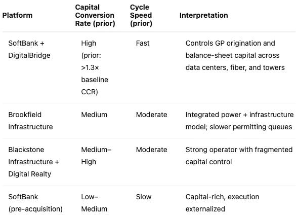 The SoftBank–DigitalBridge transaction marks the transition from capital‑as‑financing to capital‑as‑infrastructure. DigitalBridge already manages roughly $100B+ in digital infrastructure assets spanning data centers, towers, fiber, and edge platforms, giving SoftBank an immediately scaled, cross‑asset execution flywheel that directly maps to higher CCR and tighter CCI rather than a greenfield build‑up (DigitalBridge corporate overview).