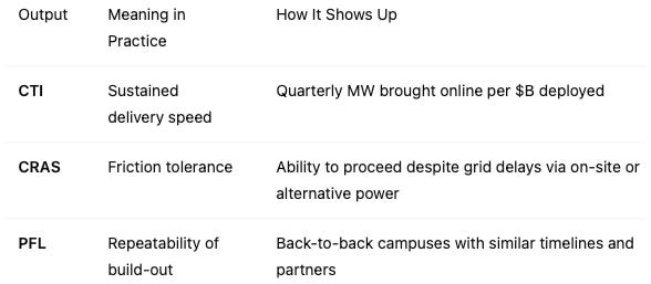 Cognitive–Motor Fidelity (CMF): execution precision across multi‑asset builds; proxied by synchronization of data‑center delivery with fiber interconnect and power commissioning dates.