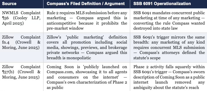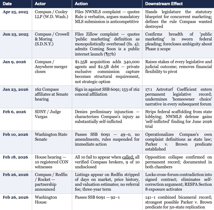 The Compass self-destruction sequence is not a story of legal misfortune. Compass’s elite antitrust counsel produced, with billable precision, the operative definitions SSB 6091 codified. The NWMLS complaint described the transparency architecture Compass wanted destroyed — and the Legislature made it permanent. The Zillow complaint defined ‘public marketing’ with the breadth of a monopolist’s overreach — and the Legislature made that breadth mandatory. The Phase 2 admission confirmed Coming Soon as a public internet launch — and removed the ambiguity Compass would have exploited in an enforcement challenge.