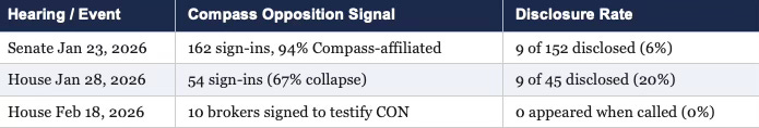 The January 28 House hearing on HB 2512 saw opposition collapse by 67% — from 162 to 54 sign-ins. Ten individuals who signed up to testify against the bill failed to appear when called — all verified Compass brokers, nine of whom concealed their affiliation.