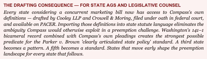 For state attorneys general advancing concurrent marketing legislation: Washington’s evidentiary record travels without regeneration. The transaction dataset, the opposition modeling, the Astroturf Coefficient, and — most critically — Compass’s own complaint definitions are documented, timestamped, and PACER-accessible. Import the definitions. Cite the complaints. Apply the 141–1 bicameral record as the Parker v. Brown predicate. Each state that follows strengthens the preemption shield for every state that comes after.