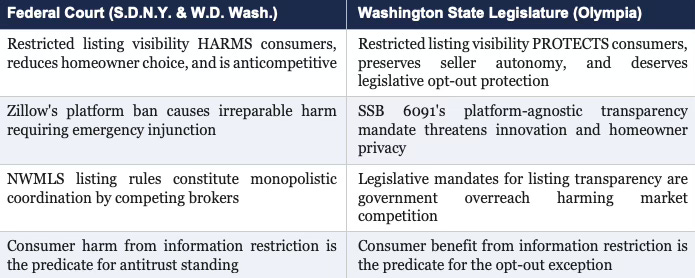 First, the narrative inversion becomes judicially dangerous. Compass’s federal complaint argues that restricted listing visibility harms consumers. SSB 6091 codifies the mirror principle: concurrent public marketing is mandatory because restricted visibility harms consumers. Compass cannot continue prosecuting the Zillow litigation on a consumer harm theory without simultaneously validating the statutory framework it lobbied to kill.