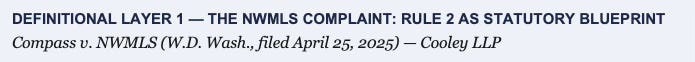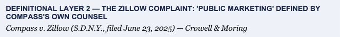 For state attorneys general: the three definitional layers are PACER-accessible, timestamped, and filed under penalty of perjury. Any state advancing a concurrent marketing bill citing Compass’s definitional framework is citing the brokerage’s own attorneys’ work product — a litigation posture Compass cannot contest without arguing against its own sworn pleadings.