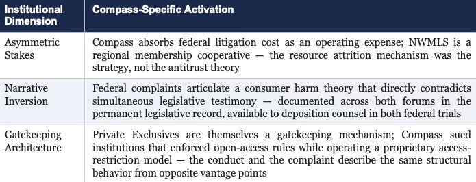 For the real estate industry: the self-destruction sequence carries a structural lesson. A brokerage built on cooperative infrastructure it does not own cannot litigate against that infrastructure without activating the incumbent protection mechanism available to every regulated industry. NWMLS did not need to outspend Compass’s antitrust budget. It needed one legislative session. Compass provided the brief.