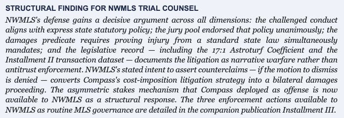 NWMLS has signaled a posture shift beyond pure defense. In December 2025, NWMLS indicated to the court that it intends to assert counterclaims if Judge Whitehead denies the motion to dismiss. NWMLS did not specify the counterclaim theories, but the litigation record supplies the predicate: a member-cooperative that suspended Compass's IDX feed for rule violations, was then sued by that member, and now faces a trial record documenting coordinated undisclosed lobbying against the state transparency mandate the cooperative's own rules anticipated — has affirmative damages claims available that Compass's litigation inadvertently constructed. The SSB 6091 legislative record, the 17:1 Astroturf Coefficient, and Compass's cross-forum narrative contradictions are available not only as defense exhibits but as the factual foundation for NWMLS's offensive case. A cooperative that files counterclaims converts Compass's litigation from a cost-imposition strategy into a bilateral damages proceeding — the asymmetric stakes mechanism inverts.