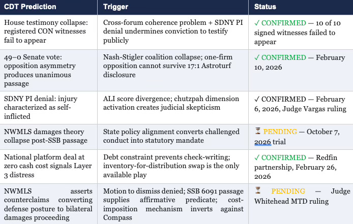 Four of six CDT predictions are confirmed. The two pending predictions — NWMLS damages theory collapse and the counterclaim posture shift — are structural consequences of events already in the record: SSB 6091's passage, the October 2026 trial schedule, and NWMLS's December 2025 counterclaim signal. The CDT methodology does not generate predictions from intuition or pattern-matching. Each output derives from a specific trigger mapped to an identified structural mechanism. When the trigger activates, the prediction follows unless a countervailing structural force intervenes. No such force is visible in the current record. The two pending predictions are not uncertain in the conventional sense — they are waiting on procedural calendars, not on evidence.