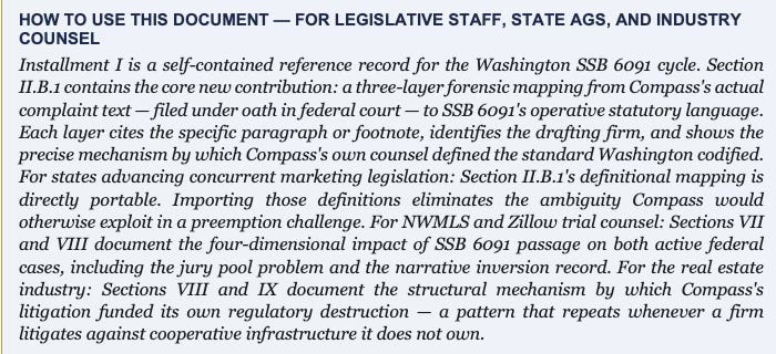 For state attorneys general and legislators: Washington’s evidentiary record — the transaction data, the opposition modeling, the complaint text, and the Astroturf Coefficient — travels to every state that follows without needing to be regenerated. For the real estate industry: the self-destruction sequence documented here is a structural case study in what happens when a brokerage deploys litigation as a market-access instrument in a cooperative-infrastructure industry it does not own.