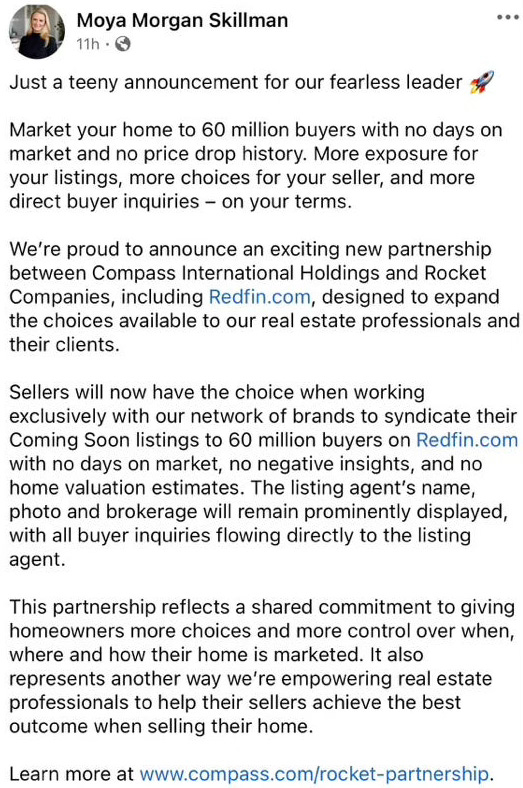 Compass broker Moya Morgan Skillman, Team Foster, announces the Redfin partnership on February 26, 2026 — framing suppressed buyer data as a seller benefit and routing all inquiries to the listing agent. Public Facebook post.