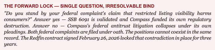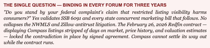 Before February 26, the cross-forum contradiction was a rhetorical constraint that counsel could attempt to manage through forum separation — arguing different things to different institutional audiences without a single venue forcing simultaneous accountability. After February 26, the contradiction is a contractual obligation. Compass is bound by signed agreement for three years to display listings stripped of days on market and price history — the exact data fields its federal complaints identify as essential to consumer welfare. Every deposition in both federal trials can reference the contract. Compass cannot settle its way out of the contradiction while the contract runs.