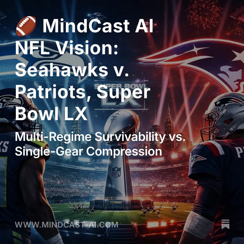 See also šš¤ MindCast AI NFL Vision: Three AIs Walk Into Super Bowl LX and Each Simulation Thinks It Knows the Ending, Seahawks vs. Patriots AI Simulation Comparison: MindCast AI, Madden NFL 26, Sportsbook Review, Super Bowl LX ā AI Simulation vs. Reality , MindCast AI NFL 2025-2026 Season Validation (forthcoming).