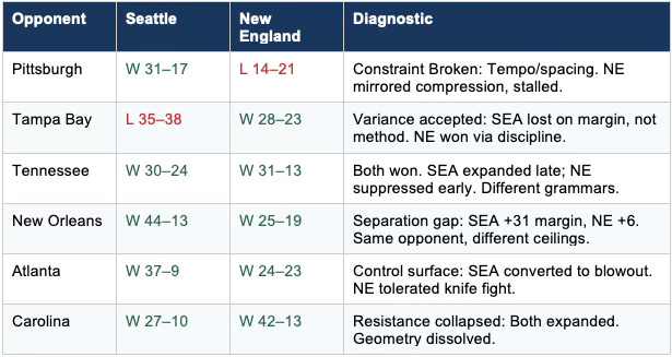 Across six common opponents, both teams finished 5ā1. That parity conceals a deeper truth. Seattleās victories resolve early and widen. New Englandās victories linger and constrict. The difference is not talentāit is how each team defines control when variance spikes.