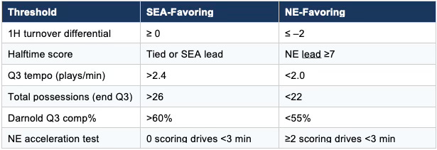 Halftime falsification check: Model weakens if NE leads ā„10 and SEA has ā¤3 pressured dropbacks and NE has produced ā„1 scoring drive under 3 minutes.