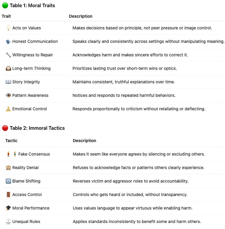 Karenina Vision evaluates two types of behavior patterns: moral traits that protect people from abusing power, and immoral tactics that allow harm to spread while appearing legitimate. Whatâs measured here isnât theoreticalâitâs behavior that either builds trust or corrodes it. Each set of traits gives us a clear view into how someone functions when their influence is challenged.