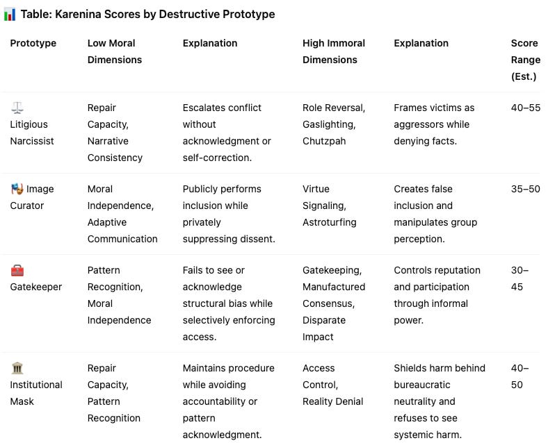 Karenina Scores translate abstract ethical dynamics into visible behavioral signatures. They show whether someone avoids accountability while appearing professional. They also show whether their power depends on truth, or on manipulation of process and perception. Low moral scores paired with high tactical use of harm reveal dangerous configurations.
