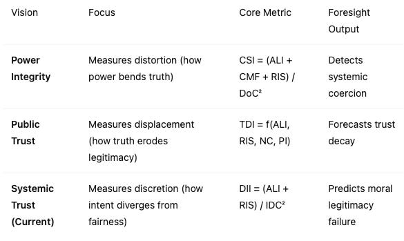 Summary: Extends Power Integrity into relational dynamics, introducing the Trust Displacement Index (TDI). It explains how institutions lose legitimacy even while appearing functional, and outlines measurable recovery strategies through the Truth & Repair Window process.