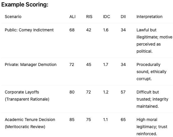 IDC is squared because intent divergence compounds distrust exponentially—a small gap in motive creates disproportionate legitimacy loss. ALI and RIS are additive because either can partially compensate for the other in edge cases. The threshold of 60 marks the point at which relational coherence and procedural trust remain strong enough to sustain legitimacy; below that, perception of fairness begins to collapse.