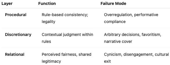 When the discretionary layer weakens, procedural legitimacy becomes brittle and relational legitimacy evaporates.