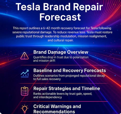 Tesla faces a 6–42 month recovery window to restore its brand and sales trajectory. This report offers a strategic assessment based on behavioral modeling of stakeholder sentiment and public response patterns. We use simulated consumer and investor profiles to analyze how leadership behavior, narrative alignment, and market trust evolve over time.