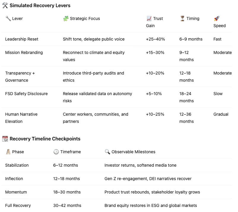 Tesla must choose between reputation recovery and reputation attrition. The current window still allows a positive arc—if leadership coherence, product integrity, and stakeholder inclusion converge. Market trust responds to truth, not claims.