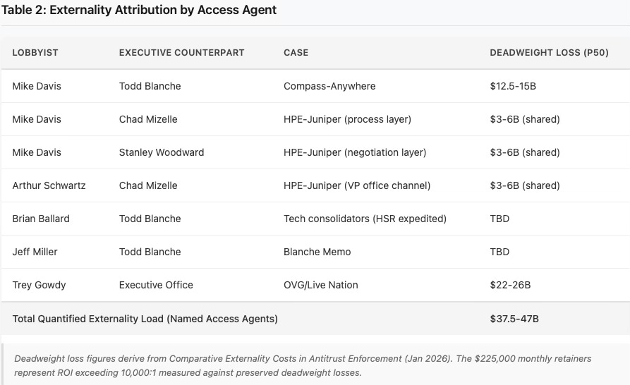 Total quantified externality load tied to named Access Arbitrage agents: $37.5–47B (P50 range). This figure represents the consumer welfare transferred to monopolists through off-docket lobbying interventions that bypassed career-staff findings and truncated structural enforcement. The $225,000 monthly retainers documented in Section VIII represent a return on investment exceeding 10,000:1 when measured against the deadweight losses preserved by successful Access Arbitrage. Regulatory outcomes now correlate with lobbying spend rather than legal merit or market metrics.